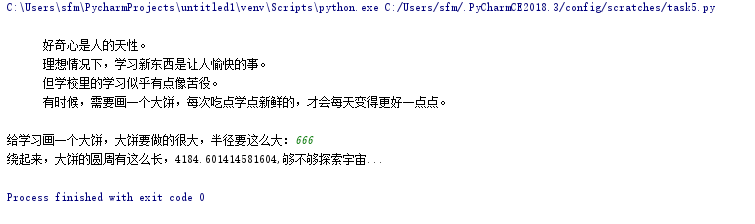 print(f'绕起来,大饼的圆周有这么长,{circle},够不够探索宇宙...')