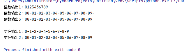 # 基础操作练习1:格式控制、列表解析、类型转换 x = list(range(10)) print('整数输出1:',end = '') for i in x : print(i, end='') print('\n整数输出2:',end = '') for i in x : print(f'{i:02d}',end = '-') # 指定每个整数输出宽度占两列,不足两列,左边补0 print('\n整数输出3:',end = '') for i in x[:-1]: print(f'{i:02d}',end = '-') print(f'{x[-1]:02d}') print('\n字符输出1:',end = '') y1 = [str(i) for i in range(10)] #函数str用于把其他类型对象转换成字符串对象 print('-'.join(y1)) print('字符输出2:',end = '') y2 = [str(i).zfill(2) for i in range(10)] #方法.zfill()用于对字符串进行格式化,指定宽度为两列,不足左边补0 print('-'.join(y2))