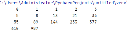 x = 0 y = 1 i = [0,1] while max(i) <1000: z = i[x] + i[y] i.append(z) x = x + 1 y = y + 1 if max(i) > 1000: i.remove(max(i)) c = 0 for m in i: print(f'{m:>8}',end = '') c =c + 1 if c % 5 == 0: print(end = '\n')