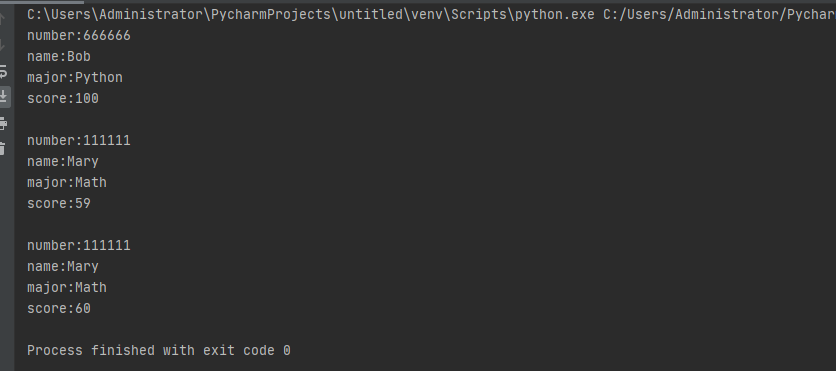 import student s1 = student.StudentDoc('666666','Bob','Python','100') s2 = student.StudentDoc('111111','Mary','Math','59') s1.info() s1.info_score() print() s2.info() s2.info_score() print() s2.info() s2.change_score('60')