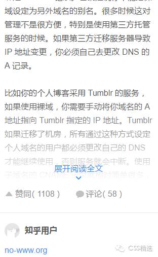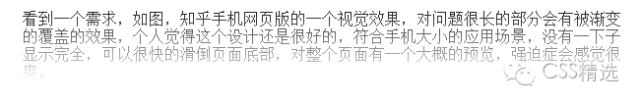 看到一个需求,如下图,知乎手机网页版的一个视觉效果,对内容很长的部分有一个渐变的隐藏的效果,个人觉得这个设计还是很好的,符合手机大小的应用场景,没有一下子显示完全,可以很快的滑倒页面底部,一定程度上减少了滑动时间,用户体验很好,对整个页面有一个大概的预览,强迫症会感觉很爽。
