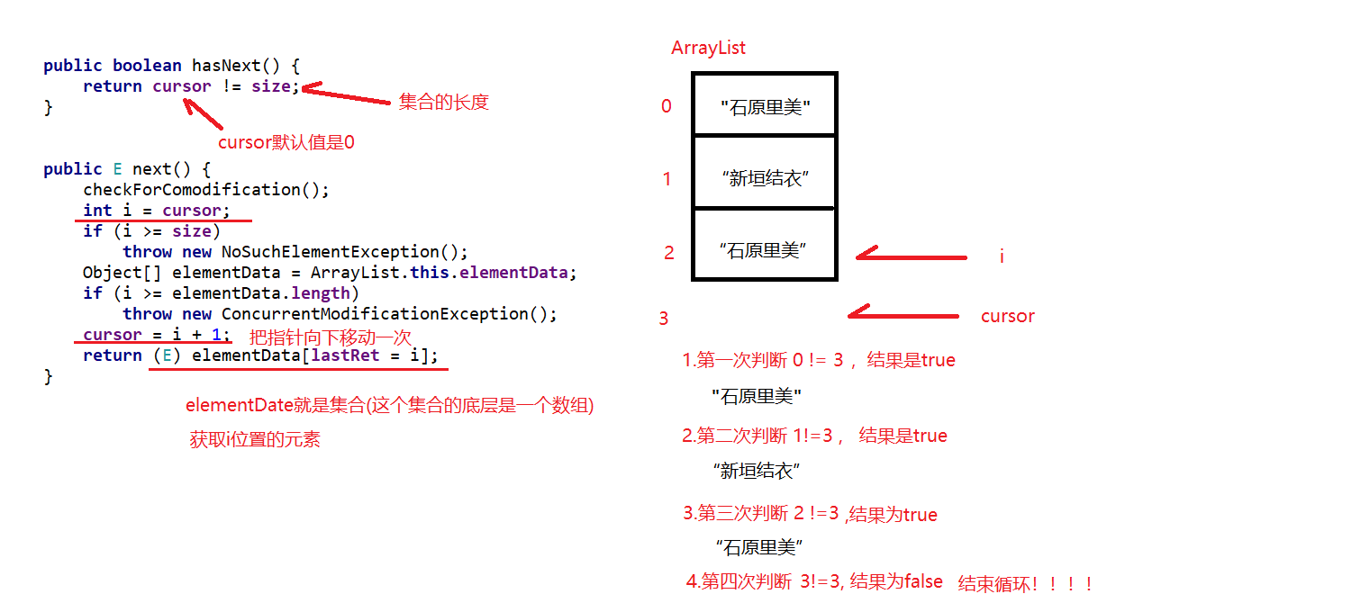 Iterator迭代器对象在遍历集合时,内部采用指针的方式来跟踪集合中的元素。在调用Iterator的next方法之前,迭代器的索引位于第一个元素之前,不指向任何元素,当第一次调用迭代器的next方法后,迭代器的索引会向后移动一位,指向第一个元素并将该元素返回,当再次调用next方法时,迭代器的索引会指向第二个元素并将该元素返回,依此类推,直到hasNext方法返回false,表示到达了集合的末尾,终止对元素的遍历。
