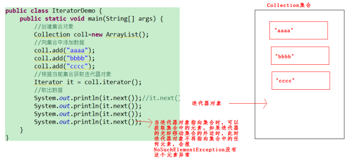 2.在进行集合元素获取时,如果集合中已经没有元素了,还继续使用迭代器的next方法,将会抛出java.util.NoSuchElementException没有集合元素异常。