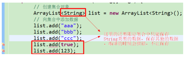 说明:由于创建ArrayList集合的时候就已经限定集合中只能保存String类型的数据,所以编译的时候保存其他的数据类型就会报错,这样就达到了我们上述保存数据的目的了。