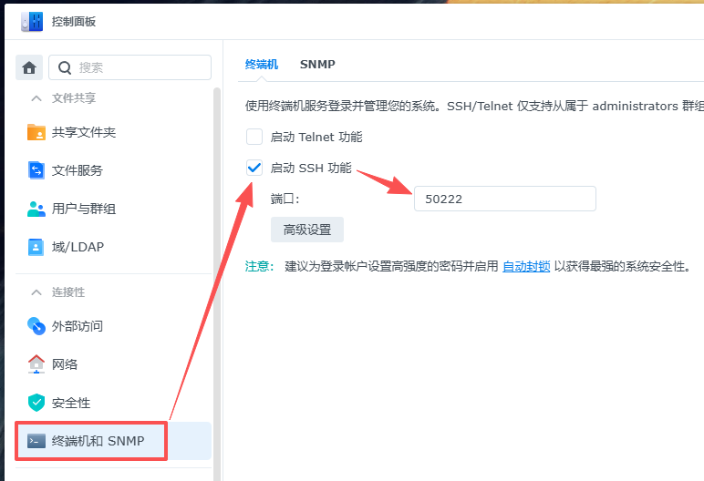 ssh+群晖用户名@内网IP 空格-p空格+端口号 (启用SSH功能设置端口号)