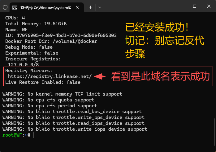 完成所有步骤后可以验证,输入docker信息命令后查看最下面的内容。