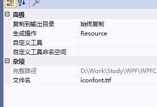 下载的iconfont.ttf字体放到Resources文件下面,并且设置生成操作为:Resource,并且始终复制