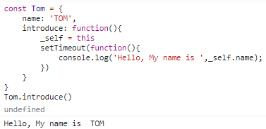 var name='zcxiaobao'; function introduce(){ console.log('Hello,My name is ', this.name); } const Tom = { name: 'TOM', introduce: function(){ setTimeout(function(){ console.log(this) console.log('Hello, My name is ',this.name); }) } } const Mary = { name: 'Mary', introduce } const Lisa = { name: 'Lisa', introduce } Tom.introduce(); setTimeout(Mary.introduce, 100); setTimeout(function(){ Lisa.introduce(); },200);