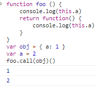 foo.call(obj): 第一层函数foo通过call将this指向obj,打印1;第二层函数为匿名函数,默认绑定,打印2。