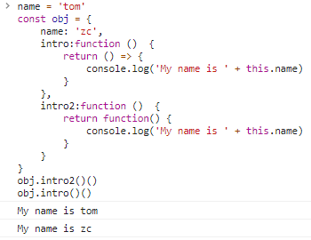 obj.intro2()(): 不做赘述,打印My name is tomobj.intro()():obj.intro()返回箭头函数,箭头函数的this取决于它的外层作用域,因此箭头函数的this指向obj,打印My name is zc箭头函数与普通函数的嵌套