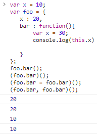 foo.bar(): 隐式绑定,打印20(foo.bar)(): 上面提到过运算符优先级的知识,成员访问与函数调用优先级相同,默认从左到右,因此括号可有可无,隐式绑定,打印20(foo.bar = foo.bar)():隐式绑定丢失,给foo.bar起别名,虽然名字没变,但是foo.bar上已经跟foo无关了,默认绑定,打印10(foo.bar, foo.bar)(): 隐式绑定丢失,起函数别名,将逗号表达式的值(第二个foo.bar)赋值给新变量,之后执行新变量所指向的函数,默认绑定,打印10。上面那说法有可能有几分难理解,隐式绑定有个定性条件,就是要满足