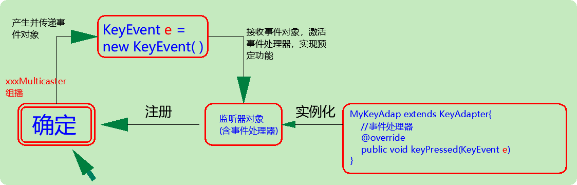 为了让时间监听器检查某个组件(事件源)是否发生了某些事,并且在发生时激活事件处理器进行响应的处理,必须在事件源上注册时间监听器。(将事件,事件源,监听器结合在一起。 当事件源上发生了某个事件,则触发执行某个监听器代码。)