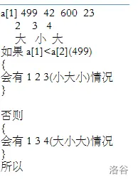 如果 $a[i]>a[i+1]$: 如果 $a[1]$ 是三者最大,呈降序,不符合条件,舍去。 如果 $a[1]$ 居中,满足“小大小”无序。 如果 $a[1]$ 是三者最小,同上。--by ahawzlc