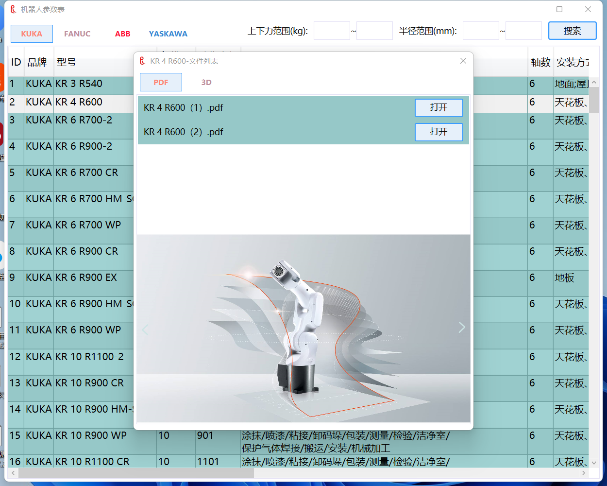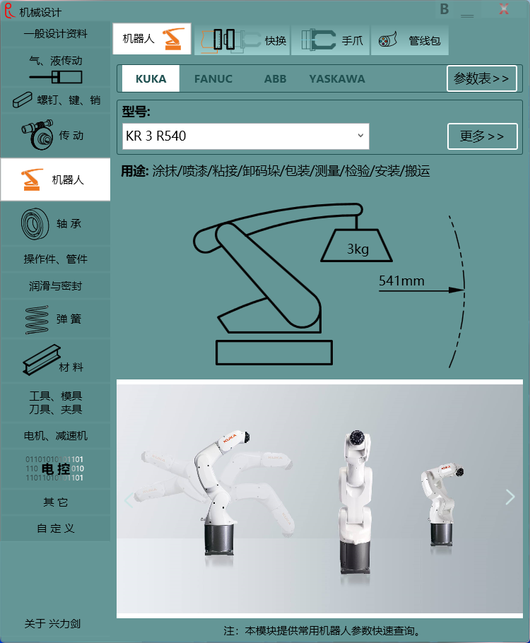 1、新增当今机器人四大家族品牌:KUKA(库卡)、FANUC(发那科)、ABB、YASKAWA(安川)查询模块;负载及行程查询、数据对比使用起来更是让你得心应手。