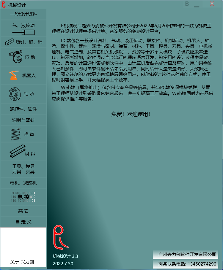 PC端包含一般设计资料、气动、液压传动、联接件、机械传动、机器人、轴承、操作件、管件、润滑与密封、弹簧、材料、工具、模具、刀具、夹具、电机减速机、电气控制、及其它相关机械设计、资源等十多个大模块,子模块随版本迭代,将不断增加。软件通过当今流行的程序语言开发,将常用的设计过程中复杂、繁琐、反复的计算通过集成到软件中,由计算机后台完成计算及查询,用户只需输入已知条件,即可由软件输出结果给到用户,同时结合大量矢量图形,大数据处理,图文并茂的方式更为直观地展现给用户,R机械设计软件这种独创的方式,使工程师很容易上手,并大幅提高工作效率,欢迎使用!!!