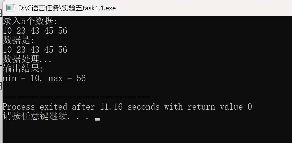 1 #include <stdio.h> 2 #define N 5 3 4 void input(int x[], int n); 5 void output(int x[], int n); 6 int *find_max(int x[], int n); 7 8 int main() { 9 int a[N]; 10 int *pmax; 11 12 printf("录入%d个数据:\n", N); 13 input(a, N); 14 15 printf("数据是: \n"); 16 output(a, N); 17 18 printf("数据处理...\n"); 19 pmax = find_max(a, N); 20 21 printf("输出结果:\n"); 22 printf("max = %d\n", *pmax); 23 24 return 0; 25 } 26 27 void input(int x[], int n) { 28 int i; 29 30 for(i = 0; i < n; ++i) 31 scanf("%d", &x[i]); 32 } 33 34 void output(int x[], int n) { 35 int i; 36 37 for(i = 0; i < n; ++i) 38 printf("%d ", x[i]); 39 printf("\n"); 40 } 41 42 int *find_max(int x[], int n) { 43 int max_index = 0; 44 int i; 45 46 for(i = 0; i < n; ++i) 47 if(x[i] > x[max_index]) 48 max_index = i; 49 50 return &x[max_index]; 51 }
