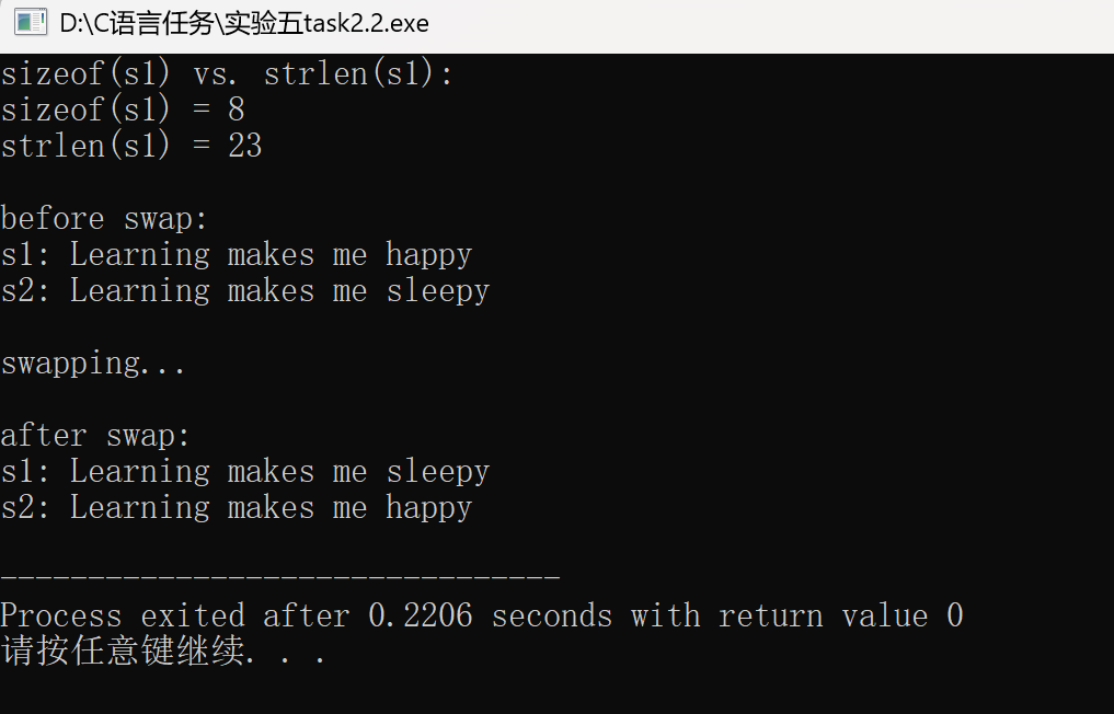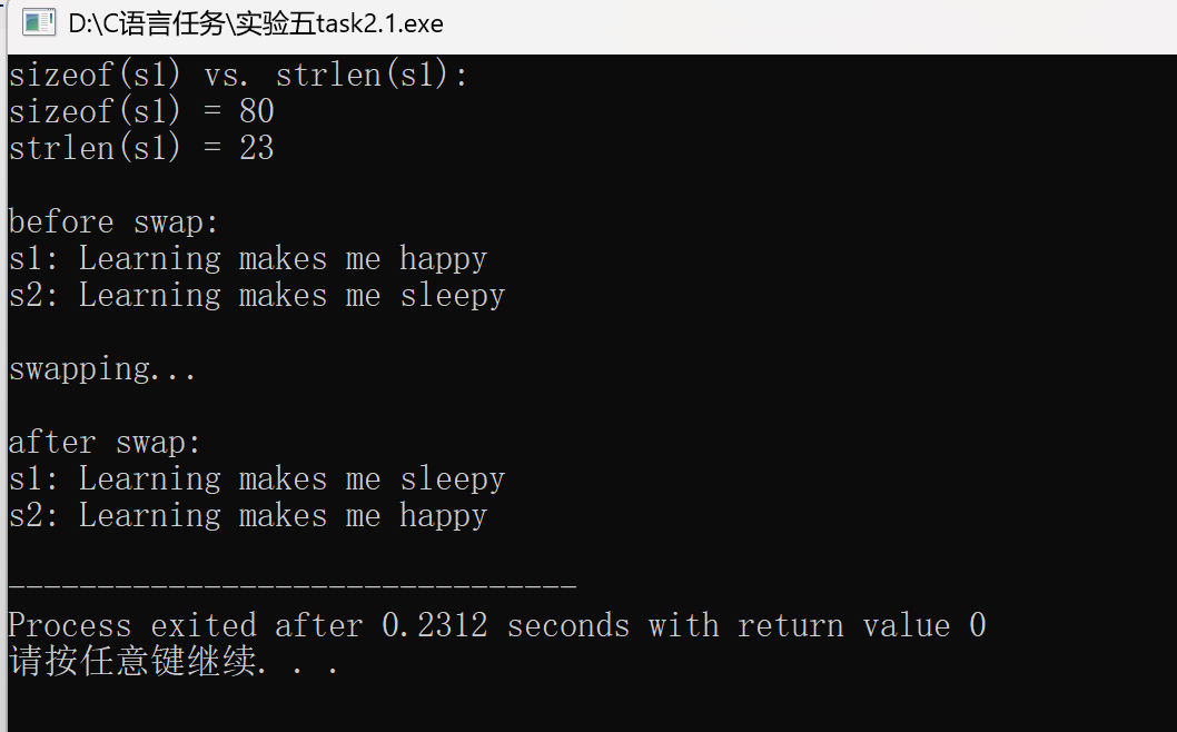 1 #include <stdio.h> 2 #include <string.h> 3 #define N 80 4 5 int main() { 6 char s1[N] = "Learning makes me happy"; 7 char s2[N] = "Learning makes me sleepy"; 8 char tmp[N]; 9 10 printf("sizeof(s1) vs. strlen(s1): \n"); 11 printf("sizeof(s1) = %d\n", sizeof(s1)); 12 printf("strlen(s1) = %d\n", strlen(s1)); 13 14 printf("\nbefore swap: \n"); 15 printf("s1: %s\n", s1); 16 printf("s2: %s\n", s2); 17 18 printf("\nswapping...\n"); 19 strcpy(tmp, s1); 20 strcpy(s1, s2); 21 strcpy(s2, tmp); 22 23 printf("\nafter swap: \n"); 24 printf("s1: %s\n", s1); 25 printf("s2: %s\n", s2); 26 27 return 0; 28 }