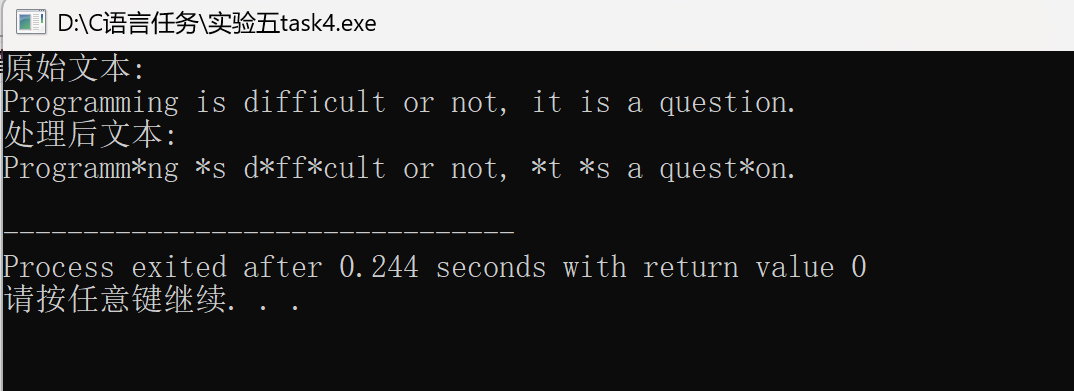 1 #include <stdio.h> 2 #define N 80 3 4 void replace(char *str, char old_char, char new_char); // 函数声明 5 6 int main() { 7 char text[N] = "Programming is difficult or not, it is a question."; 8 9 printf("原始文本: \n"); 10 printf("%s\n", text); 11 12 replace(text, 'i', '*'); // 函数调用 注意字符形参写法,单引号不能少 13 14 printf("处理后文本: \n"); 15 printf("%s\n", text); 16 17 return 0; 18 } 19 20 // 函数定义 21 void replace(char *str, char old_char, char new_char) { 22 int i; 23 24 while(*str) { 25 if(*str == old_char) 26 *str = new_char; 27 str++; 28 } 29 }