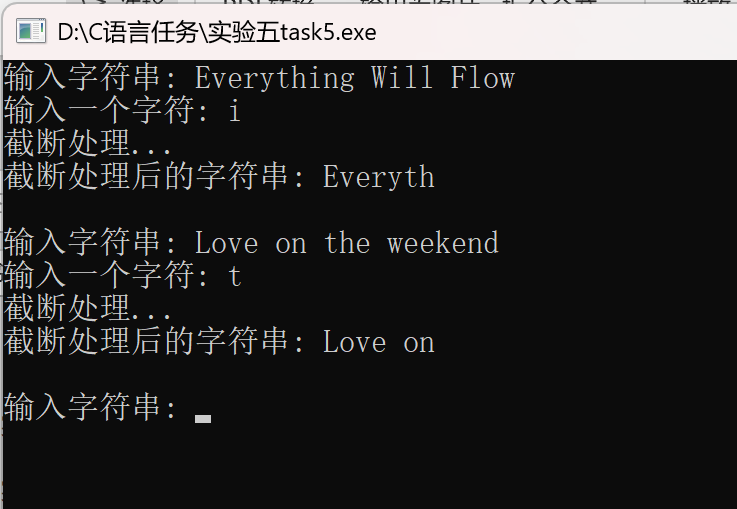 1 #include <stdio.h> 2 #define N 80 3 4 char *str_trunc(char *str, char x); 5 6 int main() { 7 char str[N]; 8 char ch; 9 10 while(printf("输入字符串: "), gets(str) != NULL) { 11 printf("输入一个字符: "); 12 ch = getchar(); 13 getchar(); // 吸收换行符 14 15 printf("截断处理...\n"); 16 str_trunc(str, ch); // 函数调用 17 18 printf("截断处理后的字符串: %s\n\n", str); 19 } 20 21 return 0; 22 } 23 24 // 函数str_trunc定义 25 // 功能: 对字符串作截断处理, 把指定字符第一次出现及其后的字符全部删除, 并返回字符串地址 26 char *str_trunc(char *str, char x) { 27 char *p = str; 28 while (*p != '\0') { 29 if (*p == x) { 30 *p = '\0'; 31 break; 32 } 33 p++; 34 } 35 return str; 36 }