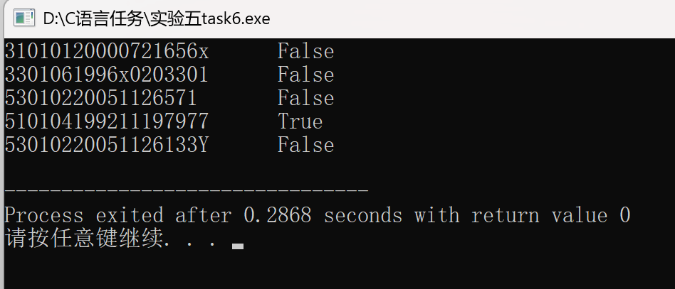 1 #include <stdio.h> 2 #include <string.h> 3 #define N 5 4 5 int check_id(char *str); 6 7 int main() { 8 char *pid[N] = {"31010120000721656x", 9 "3301061996x0203301", 10 "53010220051126571", 11 "510104199211197977", 12 "53010220051126133Y"}; 13 int i; 14 for (i = 0; i < N; ++i) { 15 if (check_id(pid[i])) 16 printf("%s\tTrue\n", pid[i]); 17 else 18 printf("%s\tFalse\n", pid[i]); 19 } 20 return 0; 21 } 22 23 int check_id(char *str) { 24 int len = strlen(str); 25 // 身份证号码必须是18位 26 if (len != 18) { 27 return 0; 28 } 29 int i; 30 for (i = 0; i < 17; i++) { 31 // 前17位只能是数字 32 if (!(str[i] >= '0' && str[i] <= '9')) { 33 return 0; 34 } 35 } 36 // 检查最后一位,只能是数字或者大写X 37 if (!(str[17] >= '0' && str[17] <= '9' || str[17] == 'X')) { 38 return 0; 39 } 40 return 1; 41 }