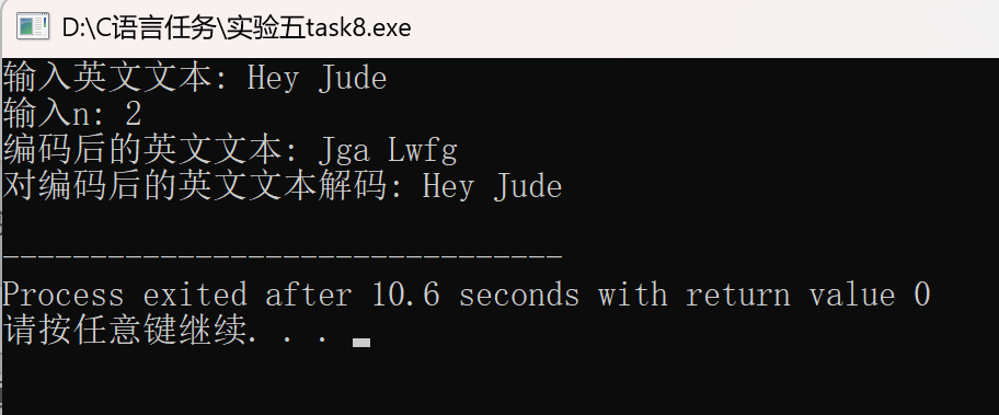 1 #include <stdio.h> 2 #include <string.h> 3 #include <ctype.h> 4 5 // 函数声明 6 void encoder(char *str, int n); 7 void decoder(char *str, int n); 8 9 int main() { 10 char words[1000]; 11 int n; 12 13 printf("输入英文文本: "); 14 fgets(words, sizeof(words), stdin); 15 // 去除fgets读取的换行符 16 words[strcspn(words, "\n")] = '\0'; 17 18 printf("输入n: "); 19 scanf("%d", &n); 20 getchar(); // 吸收换行符 21 22 printf("编码后的英文文本: "); 23 encoder(words, n); 24 printf("%s\n", words); 25 26 printf("对编码后的英文文本解码: "); 27 decoder(words, n); 28 printf("%s\n", words); 29 30 return 0; 31 } 32 33 // 对编码的字符串进行编码处理 34 // 编码规则: 每个英文字母用其后面第n个英文字母替换,字母之外的其它字符保持不变 35 void encoder(char *str, int n) { 36 int len = strlen(str); 37 for (int i = 0; i < len; i++) { 38 if (isalpha(str[i])) { // 判断是否为字母 39 if (islower(str[i])) { // 小写字母情况 40 str[i] = (str[i] - 'a' + n) % 26 + 'a'; 41 } else { // 大写字母情况 42 str[i] = (str[i] - 'A' + n) % 26 + 'A'; 43 } 44 } 45 } 46 } 47 48 // 对编码的字符串进行解码处理 49 // 解码规则: 每个英文字母用其前面第n个英文字母替换,字母之外的其它字符保持不变 50 void decoder(char *str, int n) { 51 int len = strlen(str); 52 for (int i = 0; i < len; i++) { 53 if (isalpha(str[i])) { // 判断是否为字母 54 if (islower(str[i])) { // 小写字母情况 55 str[i] = (str[i] - 'a' - n + 26) % 26 + 'a'; 56 } else { // 大写字母情况 57 str[i] = (str[i] - 'A' - n + 26) % 26 + 'A'; 58 } 59 } 60 } 61 }