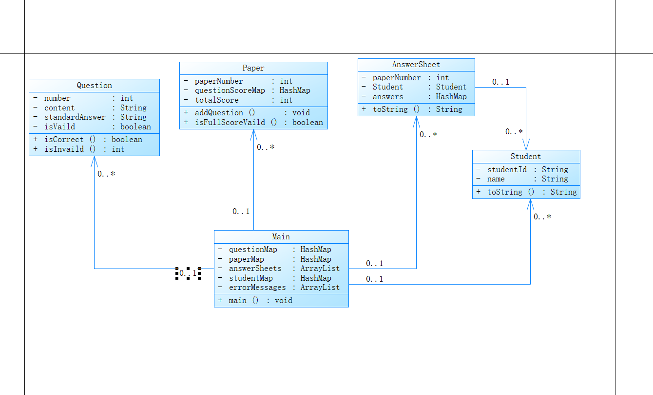 在第三次作业是在第二次作业上修改的,在question类新增isvaild属性,answersheets中的answers类型从list型改成HashMap,这样子提高了取answer时的效率。answersheet类中为了更简单一点,不是存Id而是存一个学生类,因为一张试卷对应一个学生。