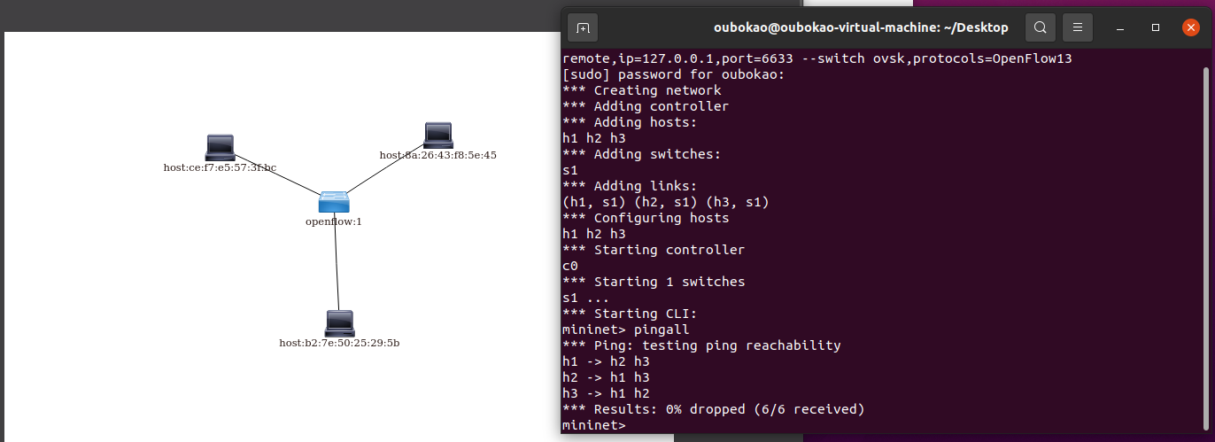 Mininet拓扑生成并连接控制器的结果