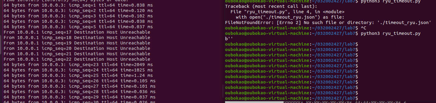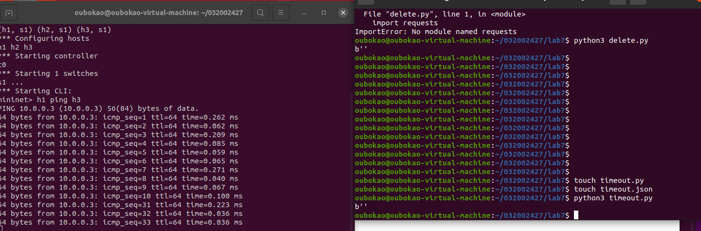 - 下发硬超时流表,实现拓扑内主机h1和h3网络中断20s。