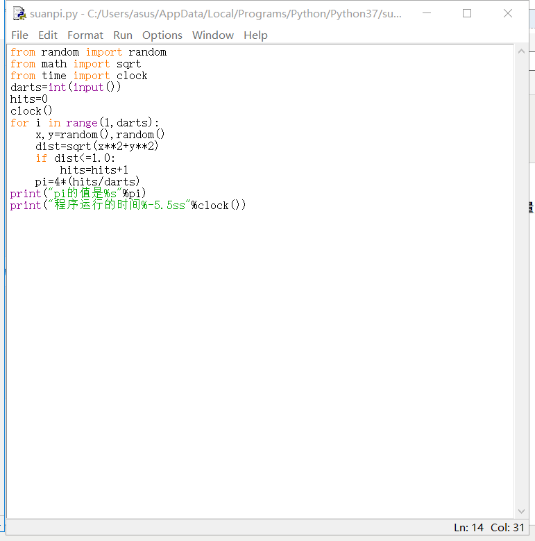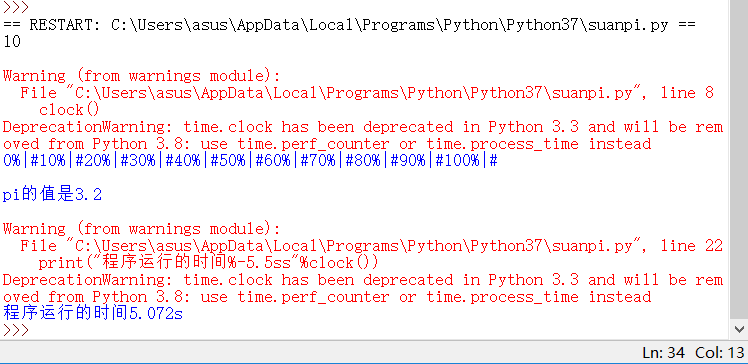 from random import random from math import sqrt from time import clock import time import sys darts=int(input()) hits=0 clock() for i in range(1,darts): x,y=random(),random() dist=sqrt(x**2+y**2) if dist<=1.0: hits=hits+1 pi=4*(hits/darts) for i in range(darts+1): sys.stdout.write('\r') sys.stdout.write("%s%%|%s"%(int(i/darts*100),'#')) sys.stdout.flush() time.sleep(0.3) print("\n") print("pi的值是%s"%pi) print("程序运行的时间%-5.5ss"%clock())