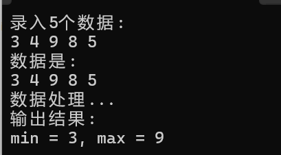 1 #include <stdio.h> 2 #define N 5 3 4 void input(int x[], int n); 5 void output(int x[], int n); 6 void find_min_max(int x[], int n, int *pmin, int *pmax); 7 8 int main() { 9 int a[N]; 10 int min, max; 11 12 printf("录入%d个数据:\n", N); 13 input(a, N); 14 15 printf("数据是: \n"); 16 output(a, N); 17 18 printf("数据处理...\n"); 19 find_min_max(a, N, &min, &max); 20 21 printf("输出结果:\n"); 22 printf("min = %d, max = %d\n", min, max); 23 24 return 0; 25 } 26 27 void input(int x[], int n) { 28 int i; 29 30 for(i = 0; i < n; ++i) 31 scanf("%d", &x[i]); 32 } 33 34 void output(int x[], int n) { 35 int i; 36 37 for(i = 0; i < n; ++i) 38 printf("%d ", x[i]); 39 printf("\n"); 40 } 41 42 void find_min_max(int x[], int n, int *pmin, int *pmax) { 43 int i; 44 45 *pmin = *pmax = x[0]; 46 47 for(i = 0; i < n; ++i) 48 if(x[i] < *pmin) 49 *pmin = x[i]; 50 else if(x[i] > *pmax) 51 *pmax = x[i]; 52 }