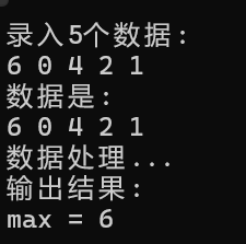 1 #include <stdio.h> 2 #define N 5 3 4 void input(int x[], int n); 5 void output(int x[], int n); 6 int *find_max(int x[], int n); 7 8 int main() { 9 int a[N]; 10 int *pmax; 11 12 printf("录入%d个数据:\n", N); 13 input(a, N); 14 15 printf("数据是: \n"); 16 output(a, N); 17 18 printf("数据处理...\n"); 19 pmax = find_max(a, N); 20 21 printf("输出结果:\n"); 22 printf("max = %d\n", *pmax); 23 24 return 0; 25 } 26 27 void input(int x[], int n) { 28 int i; 29 30 for(i = 0; i < n; ++i) 31 scanf("%d", &x[i]); 32 } 33 34 void output(int x[], int n) { 35 int i; 36 37 for(i = 0; i < n; ++i) 38 printf("%d ", x[i]); 39 printf("\n"); 40 } 41 42 int *find_max(int x[], int n) { 43 int max_index = 0; 44 int i; 45 46 for(i = 0; i < n; ++i) 47 if(x[i] > x[max_index]) 48 max_index = i; 49 50 return &x[max_index]; 51 }
