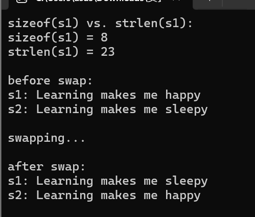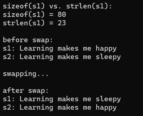 1 #include <stdio.h> 2 #include <string.h> 3 #define N 80 4 5 int main() { 6 char s1[N] = "Learning makes me happy"; 7 char s2[N] = "Learning makes me sleepy"; 8 char tmp[N]; 9 10 printf("sizeof(s1) vs. strlen(s1): \n"); 11 printf("sizeof(s1) = %d\n", sizeof(s1)); 12 printf("strlen(s1) = %d\n", strlen(s1)); 13 14 printf("\nbefore swap: \n"); 15 printf("s1: %s\n", s1); 16 printf("s2: %s\n", s2); 17 18 printf("\nswapping...\n"); 19 strcpy(tmp, s1); 20 strcpy(s1, s2); 21 strcpy(s2, tmp); 22 23 printf("\nafter swap: \n"); 24 printf("s1: %s\n", s1); 25 printf("s2: %s\n", s2); 26 27 return 0; 28 }