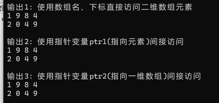 1 #include <stdio.h> 2 3 int main() { 4 int x[2][4] = {{1, 9, 8, 4}, {2, 0, 4, 9}}; 5 int i, j; 6 int *ptr1; // 指针变量,存放int类型数据的地址 7 int(*ptr2)[4]; // 指针变量,指向包含4个int元素的一维数组 8 9 printf("输出1: 使用数组名、下标直接访问二维数组元素\n"); 10 for (i = 0; i < 2; ++i) { 11 for (j = 0; j < 4; ++j) 12 printf("%d ", x[i][j]); 13 printf("\n"); 14 } 15 16 printf("\n输出2: 使用指针变量ptr1(指向元素)间接访问\n"); 17 for (ptr1 = &x[0][0], i = 0; ptr1 < &x[0][0] + 8; ++ptr1, ++i) { 18 printf("%d ", *ptr1); 19 20 if ((i + 1) % 4 == 0) 21 printf("\n"); 22 } 23 24 printf("\n输出3: 使用指针变量ptr2(指向一维数组)间接访问\n"); 25 for (ptr2 = x; ptr2 < x + 2; ++ptr2) { 26 for (j = 0; j < 4; ++j) 27 printf("%d ", *(*ptr2 + j)); 28 printf("\n"); 29 } 30 31 return 0; 32 }