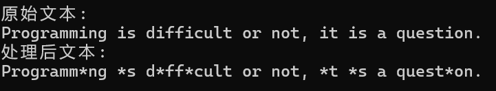 1 #include <stdio.h> 2 #define N 80 3 4 void replace(char *str, char old_char, char new_char); // 函数声明 5 6 int main() { 7 char text[N] = "Programming is difficult or not, it is a question."; 8 9 printf("原始文本: \n"); 10 printf("%s\n", text); 11 12 replace(text, 'i', '*'); // 函数调用 注意字符形参写法,单引号不能少 13 14 printf("处理后文本: \n"); 15 printf("%s\n", text); 16 17 return 0; 18 } 19 20 // 函数定义 21 void replace(char *str, char old_char, char new_char) { 22 int i; 23 24 while(*str) { 25 if(*str == old_char) 26 *str = new_char; 27 str++; 28 } 29 }