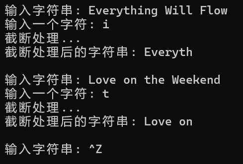 1 #include <stdio.h> 2 #define N 80 3 4 char *str_trunc(char *str, char x); 5 6 int main() { 7 char str[N]; 8 char ch; 9 10 while(printf("输入字符串: "), gets(str) != NULL) { 11 printf("输入一个字符: "); 12 ch = getchar(); 13 14 printf("截断处理...\n"); 15 str_trunc(str, ch); // 函数调用 16 17 printf("截断处理后的字符串: %s\n\n", str); 18 getchar(); 19 } 20 21 return 0; 22 } 23 24 // 函数str_trunc定义 25 // 功能: 对字符串作截断处理,把指定字符自第一次出现及其后的字符全部删除, 并返回字符串地址 26 char *str_trunc(char *str, char x){ 27 char *p = str; 28 while(*p){ 29 if(*p==x){ 30 *p='\0'; 31 break; 32 } 33 p++; 34 } 35 return p; 36 }