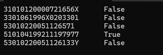 1 #include <stdio.h> 2 #include <string.h> 3 #define N 5 4 5 int check_id(char *str); // 函数声明 6 7 int main() 8 { 9 char *pid[N] = {"31010120000721656X", 10 "3301061996X0203301", 11 "53010220051126571", 12 "510104199211197977", 13 "53010220051126133Y"}; 14 int i; 15 16 for (i = 0; i < N; ++i) 17 if (check_id(pid[i])) // 函数调用 18 printf("%s\tTrue\n", pid[i]); 19 else 20 printf("%s\tFalse\n", pid[i]); 21 22 return 0; 23 } 24 25 // 函数定义 26 // 功能: 检查指针str指向的身份证号码串形式上是否合法 27 // 形式合法,返回1,否则,返回0 28 int check_id(char *str) { 29 int i; 30 if(strlen(str)!=18){ 31 return 0; 32 } 33 for(i=0;i<17;++i){ 34 if (str[i] < '0' || str[i] > '9') 35 return 0; 36 } 37 if(str[17]=='x'||(str[17]>='0'&&str[17]<='9')){ 38 return 1; 39 } 40 else{ 41 return 0; 42 } 43 44 }