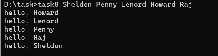 1 #include <stdio.h> 2 3 int main(int argc, char *argv[]) { 4 5 int i,j; 6 for(i=1;i<argc-1;++i){ 7 for(j=1;j<argc-i;++j){ 8 if(strcmp(argv[j],argv[j+1])>0){ 9 char *temp = argv[j]; 10 argv[j]=argv[j+1]; 11 argv[j+1]=temp; 12 } 13 } 14 } 15 16 for(i = 1; i < argc; ++i) 17 printf("hello, %s\n", argv[i]); 18 19 return 0; 20 }