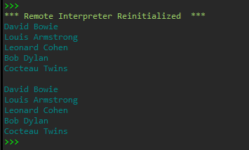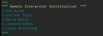 1 #4 2 name_list=['david bowie','louis armstrong','leonard cohen','bob dylan','cocteau twins'] 3 name_list=sorted(name_list) 4 t=[] 5 i=0 6 while i<len(name_list): 7 t.append(name_list[i].title()) 8 print(f'{i+1}.'+t[i],end='\n') 9 i+=1