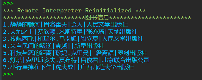 1 #6 2 book_list = [['静静的顿河','肖洛霍夫','金人', '人民文学出版社'], 3 ['大地之上','罗欣顿.米斯特里','张亦琦', '天地出版社'], 4 ['夜航西飞', '柏瑞尔.马卡姆', '陶立夏', '人民文学出版社'], 5 ['来自民间的叛逆', '袁越', '','新星出版社'], 6 ['科技与恶的距离', '珍妮.克里曼', ' 詹蕎語', '墨刻出版社'], 7 ['灯塔','克里斯多夫.夏布特','吕俊君','北京联合出版公司'], 8 ['小行星掉在下午','沈大成', '', '广西师范大学出版社']] 9 print('{0:*^50}'.format('图书信息')) 10 for i in range(1,8): 11 print(f'{i}'+'.'+'|'.join(str(o) for o in book_list[i-1]))