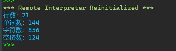 1 #5 2 text=''' 3 The Zen of Python, by Tim Peters 4 Beautiful is better than ugly. 5 Explicit is better than implicit. 6 Simple is better than complex. 7 Complex is better than complicated. 8 Flat is better than nested. 9 Sparse is better than dense. 10 Readability counts. 11 Special cases aren't special enough to break the rules. 12 Although practicality beats purity. 13 Errors should never pass silently. 14 Unless explicitly silenced. 15 In the face of ambiguity, refuse the temptation to guess. 16 There should be one-- and preferably only one --obvious way to do it. 17 Although that way may not be obvious at first unless you're Dutch. 18 Now is better than never. 19 Although never is often better than *right* now. 20 If the implementation is hard to explain, it's a bad idea. 21 If the implementation is easy to explain, it may be a good idea. 22 Namespaces are one honking great idea -- let's do more of those!''' 23 l=len(text.splitlines()) 24 w=len(text.split()) 25 z=len(text) 26 k=text.count(' ') 27 print(f'行数:{l}') 28 print(f'单词数:{w}') 29 print(f'字符数:{z}') 30 print(f'空格数:{k}')