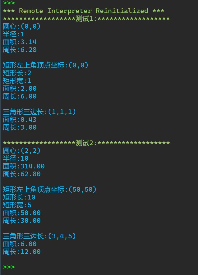 1 #2 2 class Shape: 3 def info(self): 4 pass 5 6 def area(self): 7 pass 8 9 def perimeter(self): 10 pass 11 12 class Rect(Shape): 13 def __init__(self,x=0,y=0,length=2,width=1): 14 self._x=x 15 self._y=y 16 self._width=width 17 self._length=length 18 19 def info(self): 20 print(f'矩形左上角顶点坐标:({self._x},{self._y})') 21 print(f'矩形长:{self._length}') 22 print(f'矩形宽:{self._width}') 23 24 def area(self): 25 return self._length * self._width 26 27 def perimeter(self): 28 return(self._length+self._width)*2 29 30 class Circle(Shape): 31 def __init__(self,x=0,y=0,radius=1): 32 self._x=x 33 self._y=y 34 self._r=radius 35 36 def info(self): 37 print(f'圆心:({self._x},{self._y})') 38 print(f'半径:{self._r}') 39 40 def area(self): 41 return 3.14*self._r*self._r 42 43 def perimeter(self): 44 return 3.14*2*self._r 45 46 class Triangle(Shape): 47 def __init__(self,a=1,b=1,c=1): 48 self._a,self._b,self._c=a,b,c 49 50 def info(self): 51 print(f'三角形三边长:({self._a},{self._b},{self._c})') 52 53 def area(self): 54 s=(self._a+self._b+self._c)/2 55 ans=(s*(s-self._a)*(s-self._b)*(s-self._c))**0.5 56 57 return ans 58 59 def perimeter(self): 60 return(self._a+self._b+self._c) 61 62 def main(): 63 print('测试1:'.center(40,'*')) 64 shapes_lst1=[Circle(),Rect(),Triangle()] 65 for t in shapes_lst1: 66 t.info() 67 print(f'面积:{t.area():.2f}') 68 print(f'周长:{t.perimeter():.2f}') 69 print() 70 71 print('测试2:'.center(40,'*')) 72 shapes_lst2=[Circle(x=2,y=2,radius=10), 73 Rect(x=50,y=50,length=10,width=5), 74 Triangle(a=3,b=4,c=5)] 75 for t in shapes_lst2: 76 t.info() 77 print(f'面积:{t.area():.2f}') 78 print(f'周长:{t.perimeter():.2f}') 79 print() 80 81 if __name__=='__main__': 82 main()