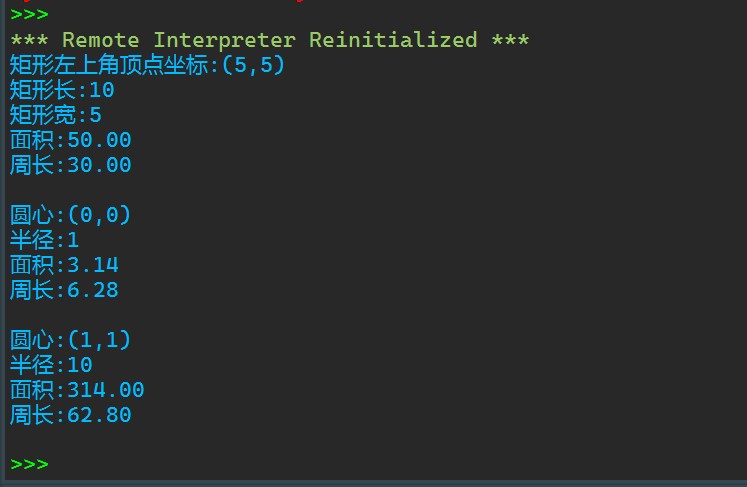 1 #2.2 2 from shape import Rect,Circle 3 4 shape_lst=[Rect(5,5,10,5),Circle(),Circle(1,1,10)] 5 6 for i in shape_lst: 7 i.info() 8 print(f'面积:{i.area():.2f}') 9 print(f'周长:{i.perimeter():.2f}') 10 print()