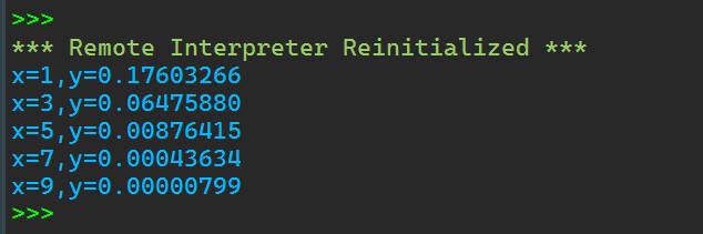 1 #3 2 from math import * 3 def func(x): 4 m=0 5 s=2 6 return (1/(2*pi)**0.5/s)*exp(-0.5*((x-m)/s)**2) 7 8 for i in range(1,10,2): 9 print(f'x={i},y={func(i):.8f}')
