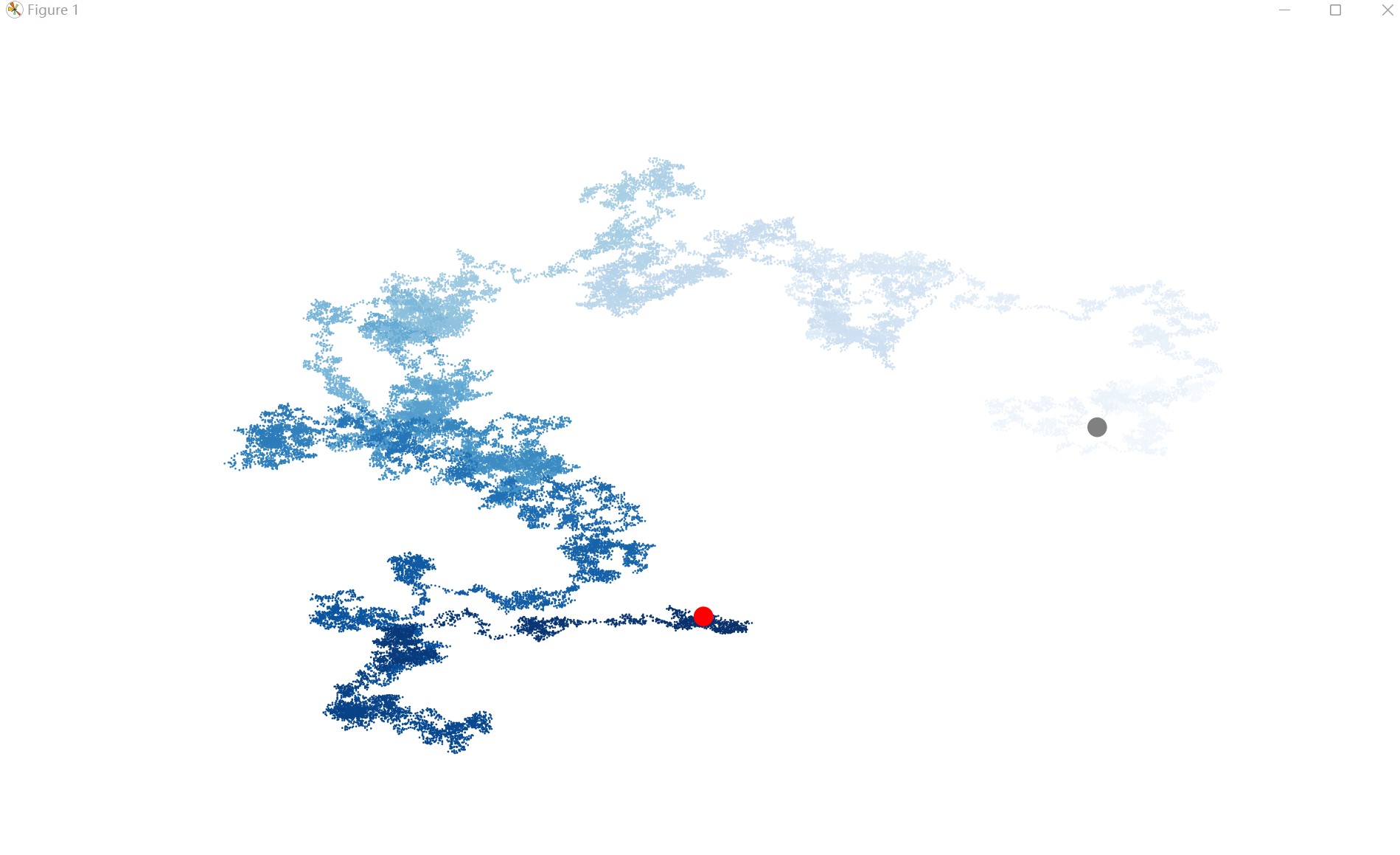 1 #4.2 2 from matplotlib import pyplot as plt 3 from random_walk import RandomWalk 4 from time import sleep 5 6 n=0 7 while n<2: 8 n+=1 9 rw=RandomWalk(50000) 10 rw.fill_walk() 11 12 plt.figure(figsize=(10,6),dpi=128) 13 point_numbers=list(range(rw.num_points)) 14 plt.scatter(rw.x_values,rw.y_values,c=point_numbers,cmap=plt.cm.Blues,edgecolors='none',s=1) 15 16 plt.scatter(0,0,c='grey',edgecolors='none',s=100) 17 plt.scatter(rw.x_values[-1],rw.y_values[-1],c='red',edgecolors='none',s=100) 18 19 plt.axis('off') 20 plt.show()
