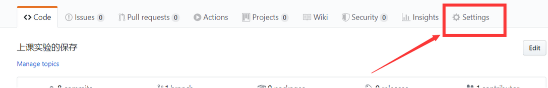 1. 打开自己GitHub的具体代码仓库,在界面中选择 Settings(设置):