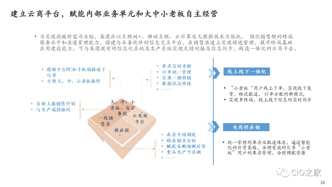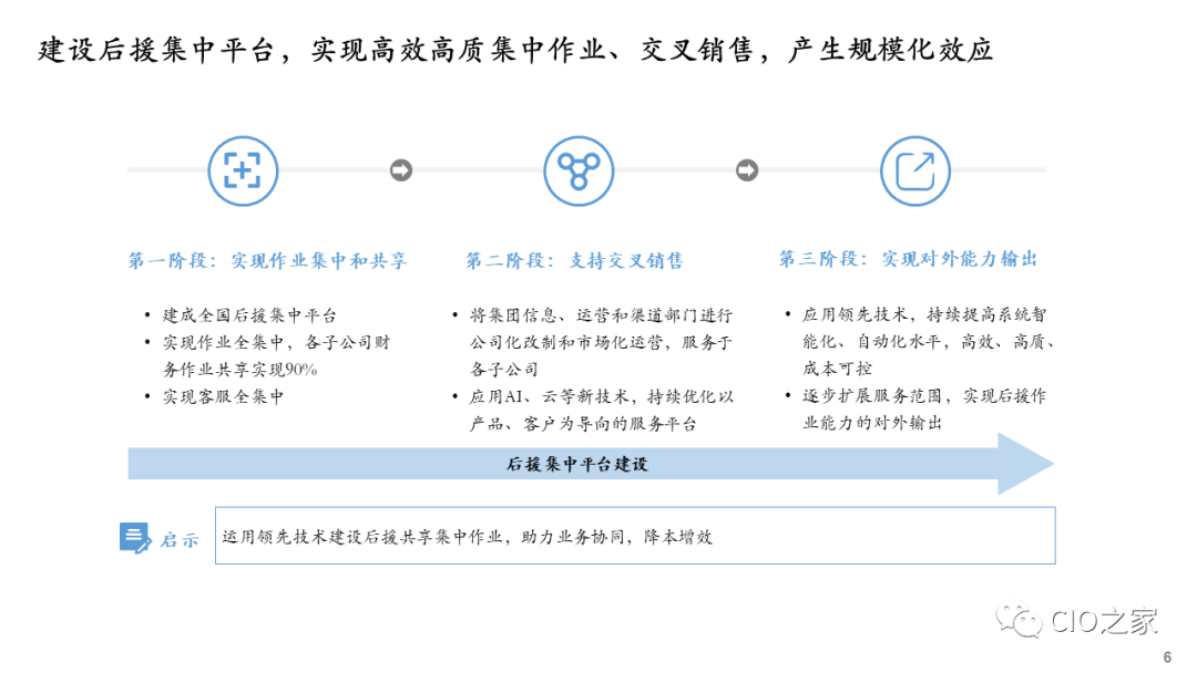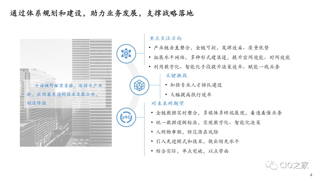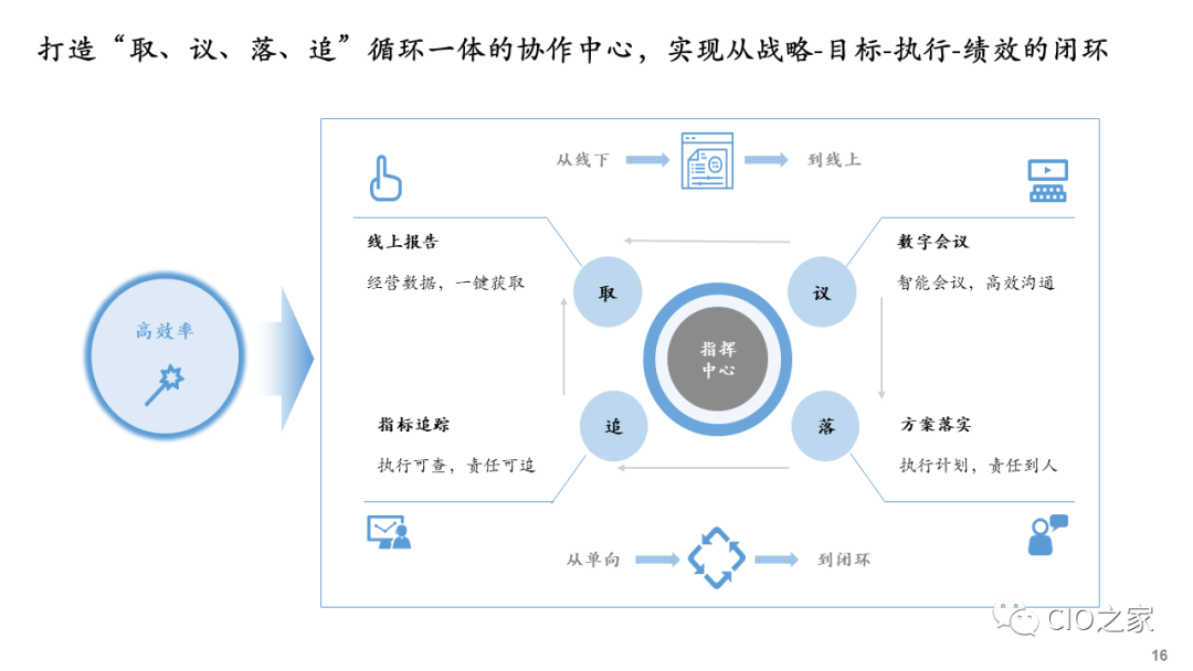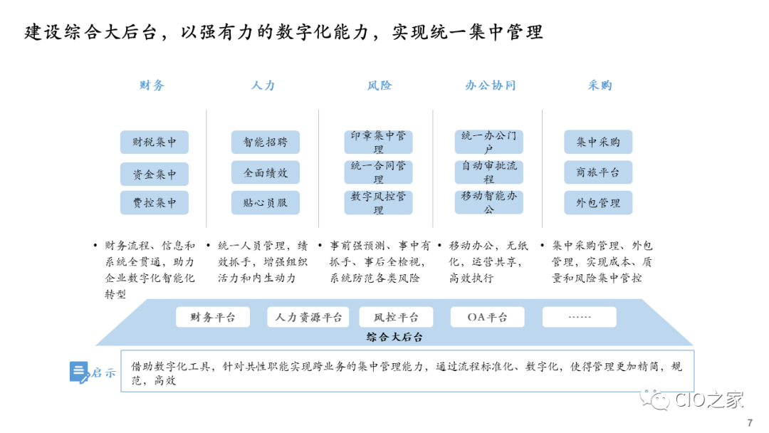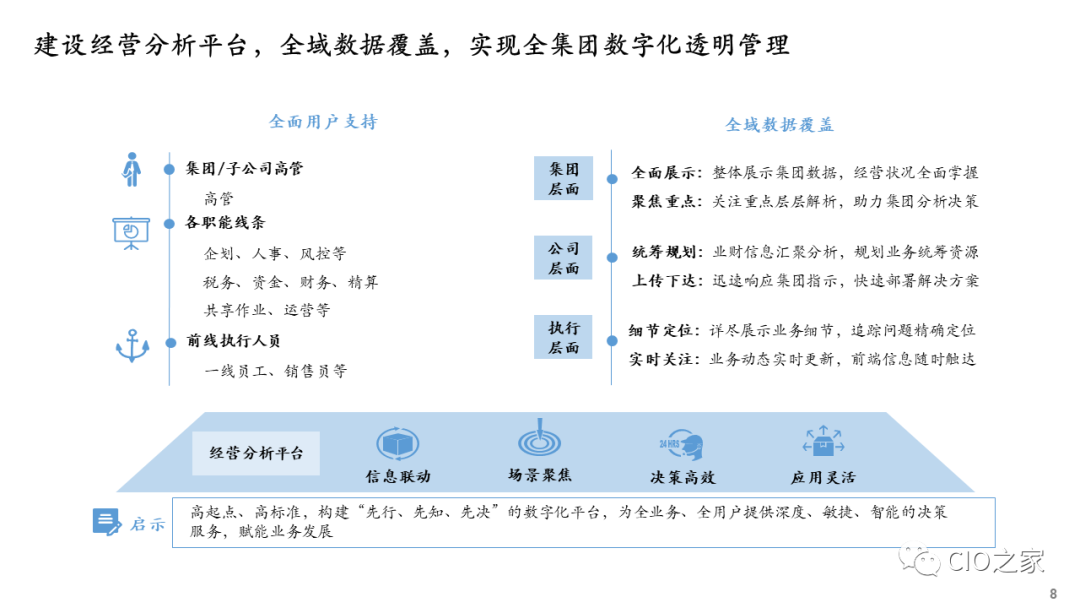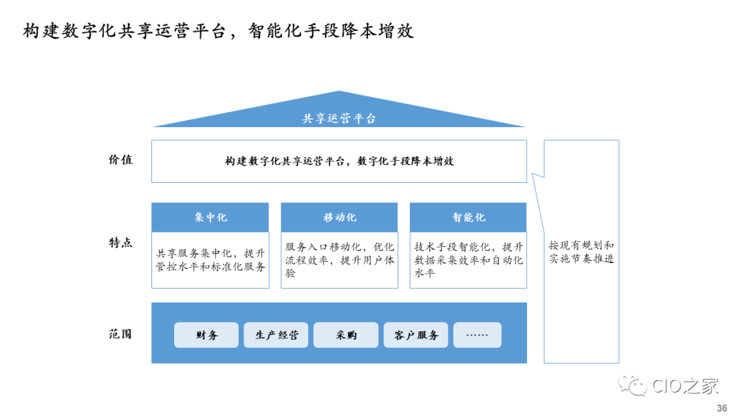 企业开展数字化转型,需要在行动早期进行数字化转型规划,确保数字化转型有明确的战略目标、适当的策略和相匹配的资源,尤其重要的是确保数字化技术平台与业务、运营和组织的高度融合,而且彼此间相互配称。