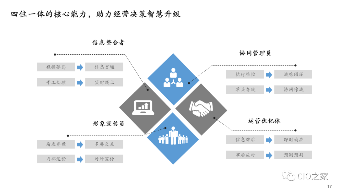 数字化转型应该是千人千面,因为每家企业的难点痛点不一样,所以每家企业的转型路径都不尽相同。数字化转型不是为了转型而转型,必须是围绕解决企业最大痛点,以它做切入点,回报才最快、投入产出比才最高。所以常想,数字化转型第一件事情就要解决数字化转型的切入点。