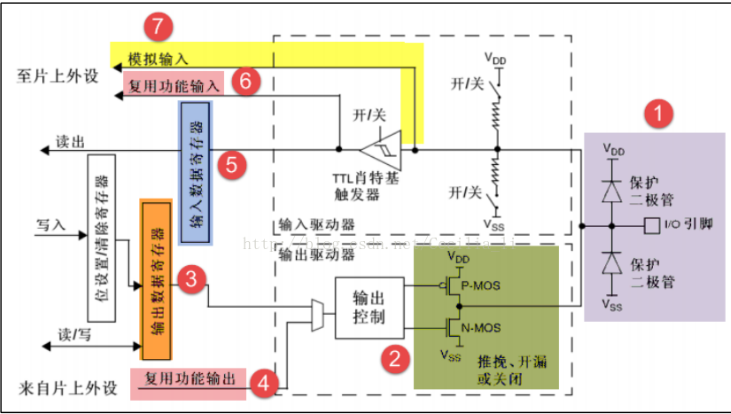 1、保护二极管:防止引脚外部输入电压过高or过低
