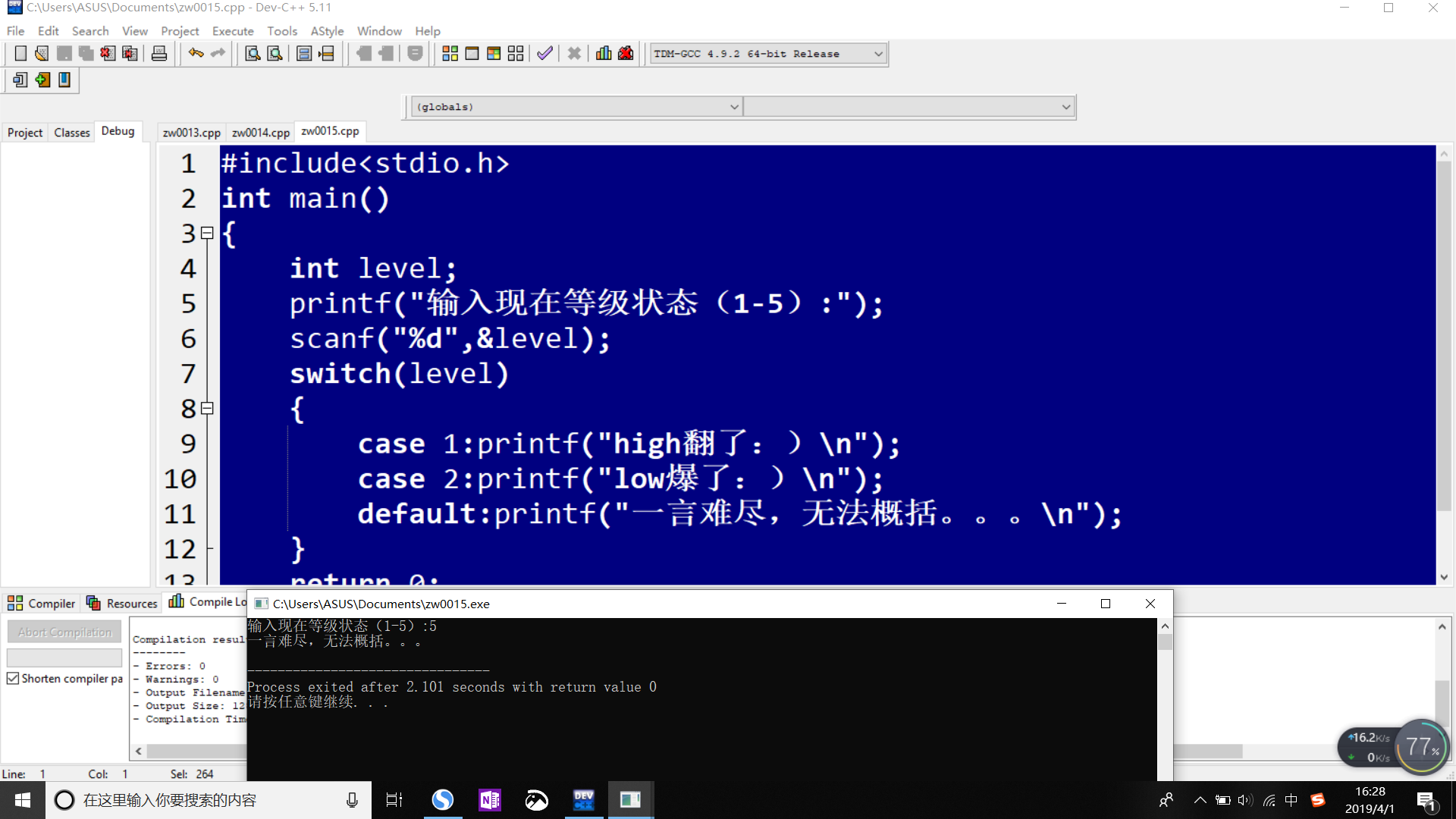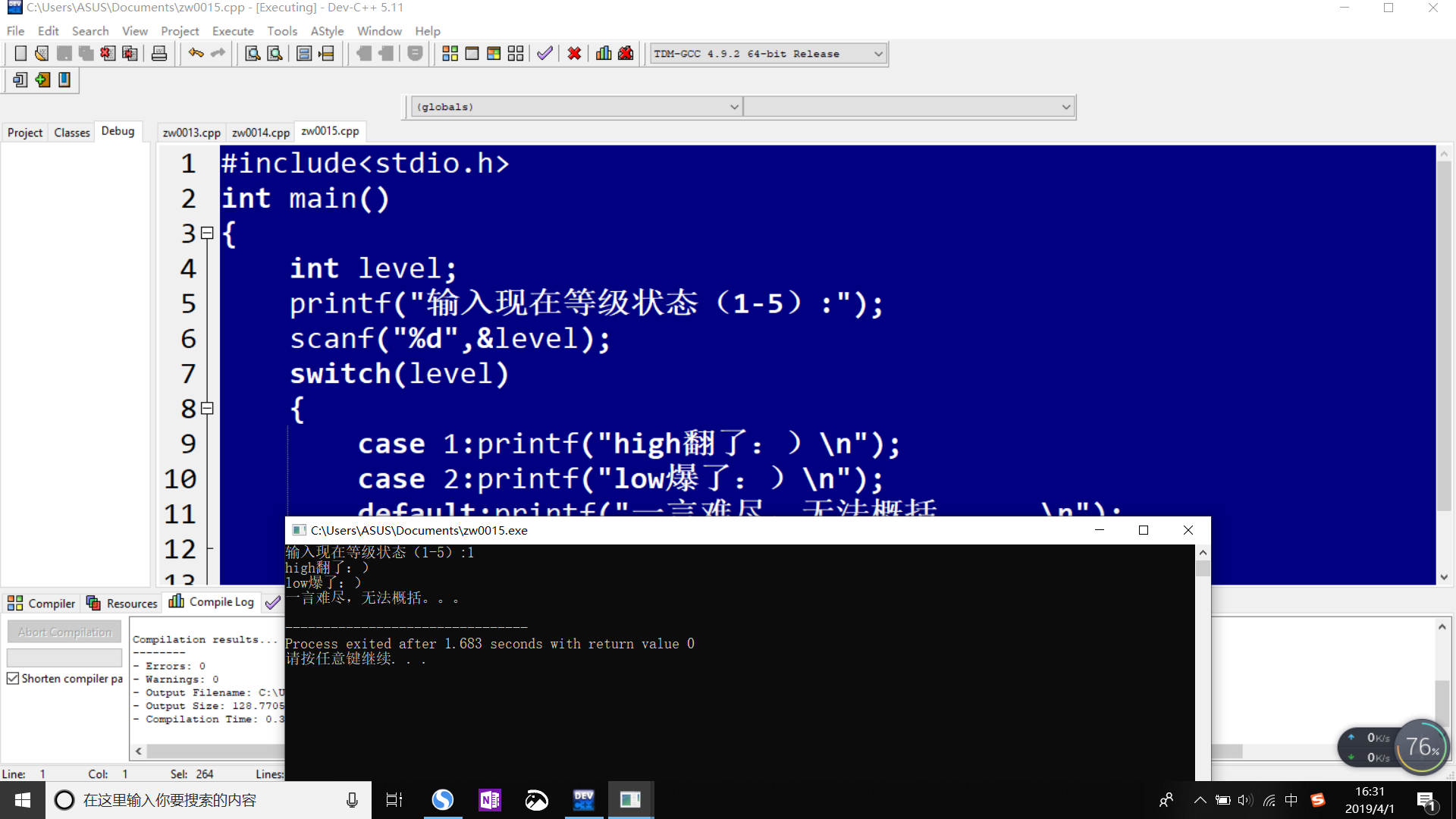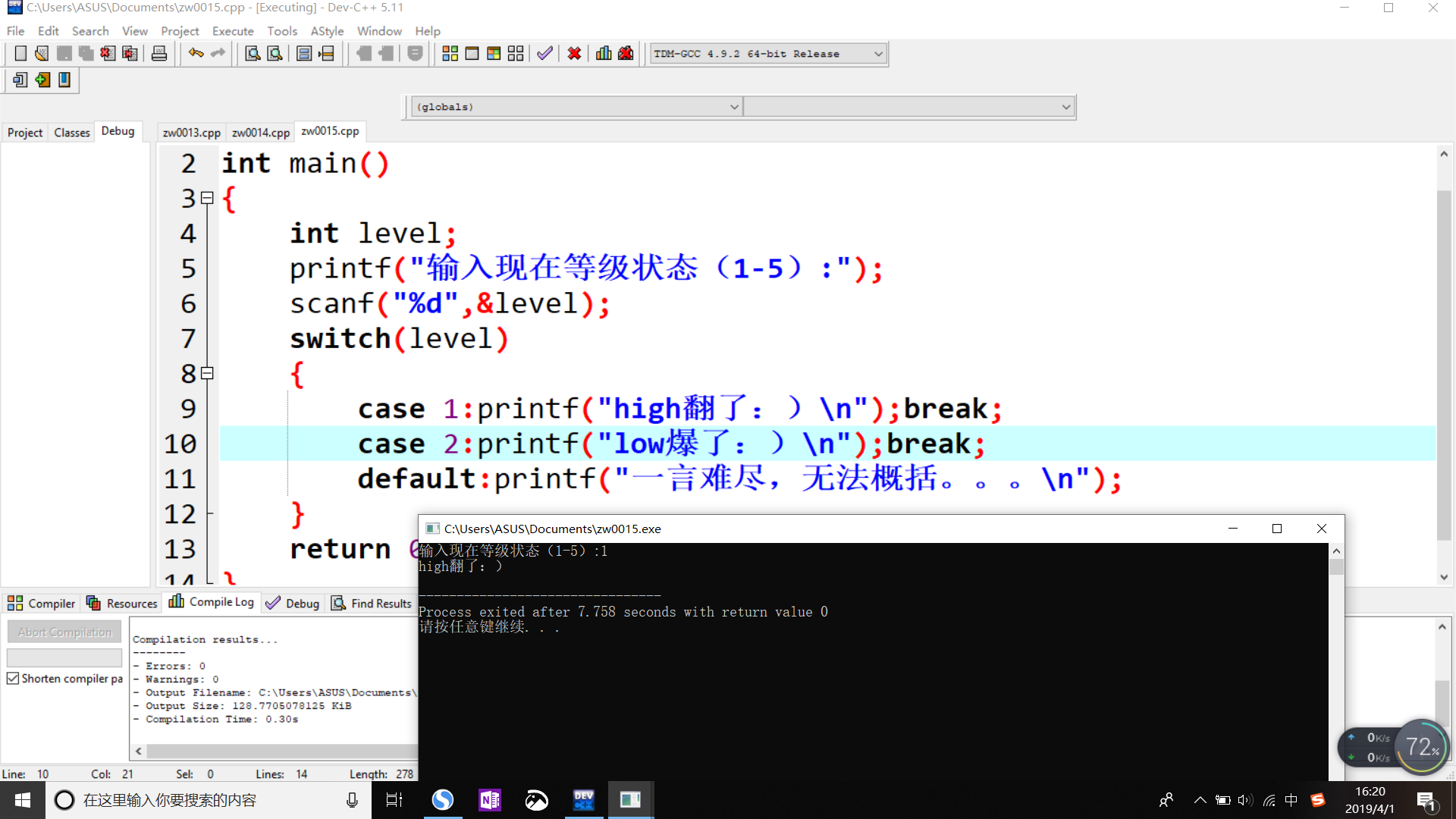 case 1:printf("high翻了:)\n");break;