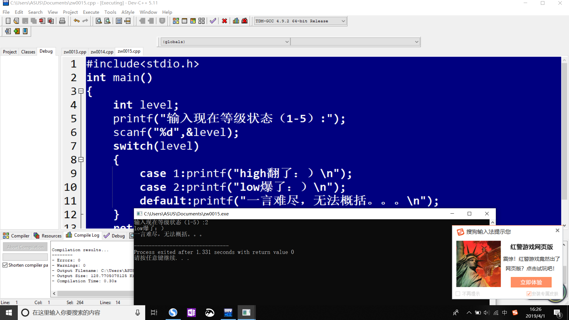 case 2:printf("low爆了:)\n");break;